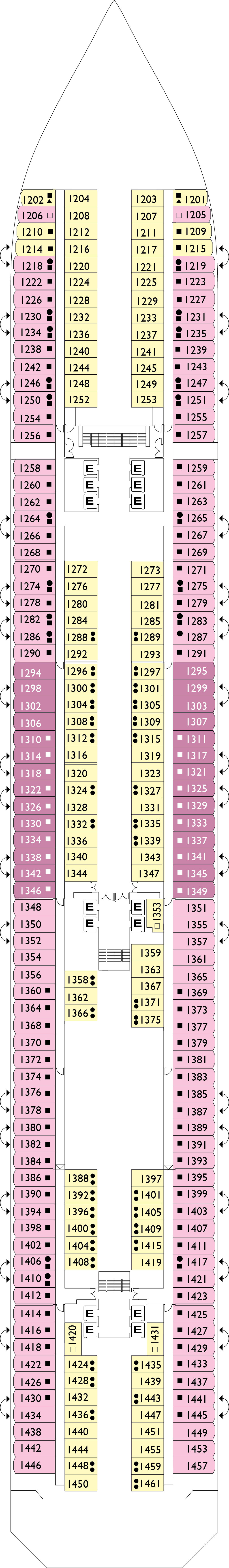 Premium cabins are located on deck 9, deck 8, deck 7, deck 6 with double bed or 2 single beds that can convert to 3rd/4th bed (a sofa bed + 1 high foldaway bed). Private balcony with table and chairs. Bathroom with shower and WC, hairdryer, Tv, radio, phone, minibar, air conditioning, safe. Option of breakfast in room & 24hour room service.